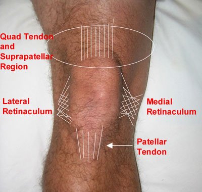 To mobilize these structures, place your fingers above the patella and move the tissue side-to-side, as if you are massaging the muscle just above the patella. The quad tendon and the suprapatellar pouch are not easy structures to palpate and are not very distinct from one another. With this in mind, do not be discouraged if you do not feel much when you are mobilizing here.