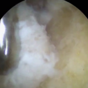 Initially portals (keyholes) are made on both sides of the patellar tendon a little proximal to (higher up from) the tibial tubercle. On one side I introduce an arthroscope, which has a light source, camera and fluid irrigation, and on the other side I introduce a motorised instrument which has a rotating shaver burr at its end.
