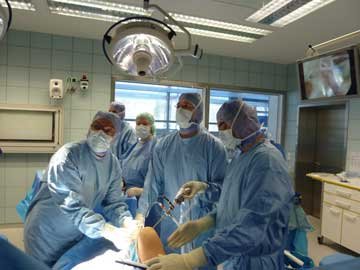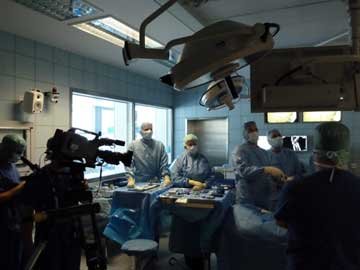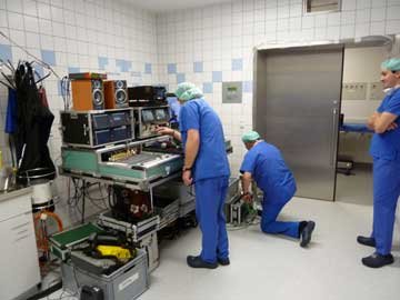 Here are two photos - one showing the surgical staff preparing the patient for surgery while the other shows the recording team seeing to the video and sound equipment.